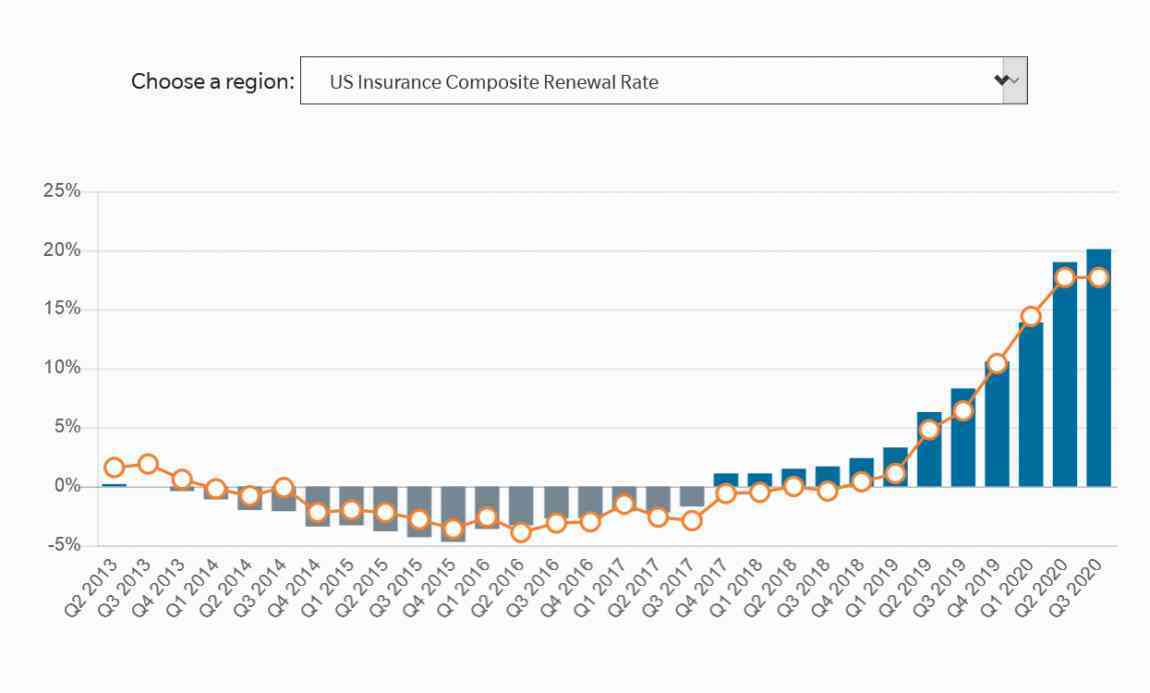 According to the data in the latest survey from global broker Marsh covering property and casualty insurance renewals, prices rose by some 20%, the largest increase since the index was launched in 2012
