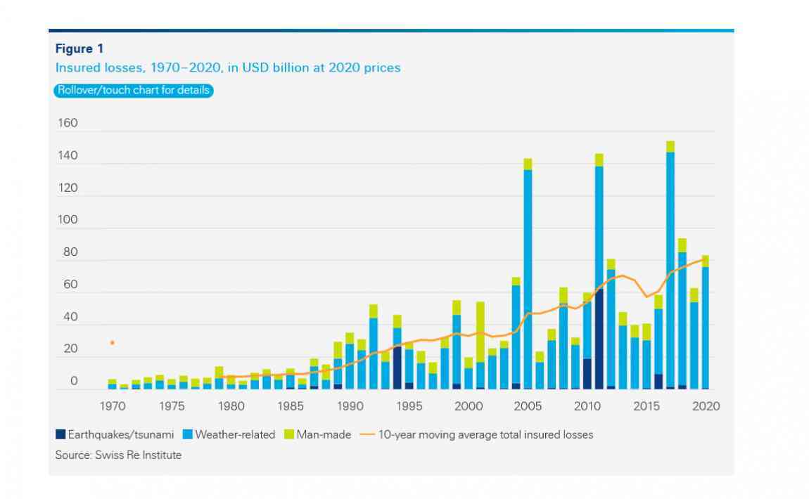 - Level of economic losses from man made and natural catastrophe losses of US$187bn up 25% on 2019;